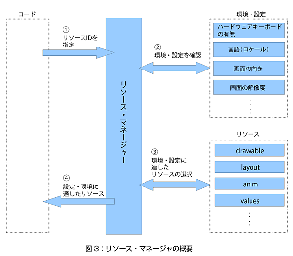 この「リソース・マネージャ」には、もう1つ大きな役割があります。リソースを特定する時に、端末の設定や状態に応じて、指定されたリソースIDに対応した複数のリソースの中から、最適なものを自動的に選択するのです。