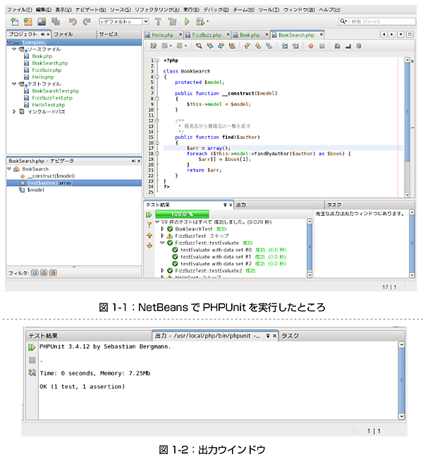 インストール手順や、PHPプロジェクトの作成手順については、プロジェクトのドキュメントやNetBeansのヘルプを参照してください。これまで本 連載で作成してきたテストを実行させたときの画面が、図1-1になります。