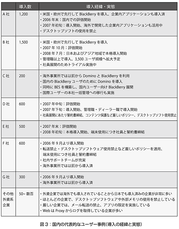 特に、金融系(銀行、証券、保険など)、監査法人、医薬系においては、セキュリティの高さを理由にBlackBerryの採用が進んでいます。製造、大手商社、流通、小売りなどでは、データ通信量の少なさを理由に、海外出張が多い社員を中心に展開が進んでいます(ローミング料金を抑えるため)。