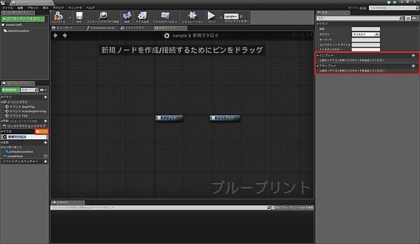 続いて、画面右側にあるインプットとアウトプットの「+」をクリックして、それぞれに「integer」型の値を追加します(新規にマクロを作成すると、自動でマクロ編集タブに遷移します)。すると、ブループリントにインプットとアウトプットのノードが追加されます。