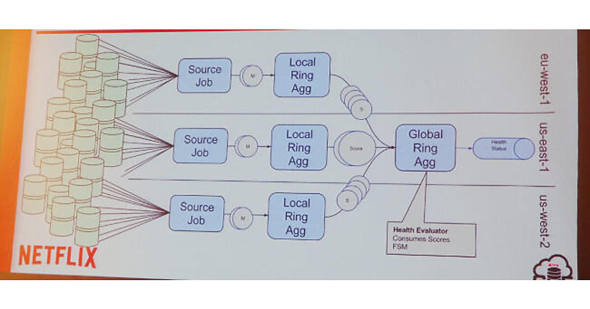 Netflixは、クラウドネイティブでリアクティブなシステムを構築した先進的な事例として有名だ。同社は複数のデータセンターを活用して動画をストリーミングで配信しているビジネスを展開しているが、セッションの内容はそのビジネスを支える監視システムに関するものだ。NetflixのバックエンドはインフラストラクチャーがAWS、分散データベースにはCassandraが使われているという。さらにCassandraのバックアップツールであるPriam、各サーバーやプロセスの監視ツールとしてMantisというソフトウェアがNetflix社内で開発され、Apacheライセンスのオープンソースソフトウェアとして公開されている。