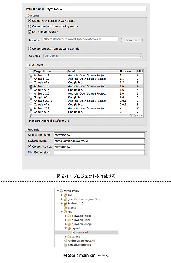 android:id="@+id/main_webview"は、このWebViewに識別子をつけた、ということを意味します。この識別子については、次の章で詳しく説明します。