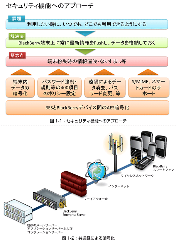 BlackBerryは、生産性を向上させるモバイル・ツールとして情報へのアクセス速度も重視しつつ、その一方でセキュリティ・リスクをコントロールすることを目指しています。このセキュリティ機能への取り組みを図示すると、図1-1の通りとなります。