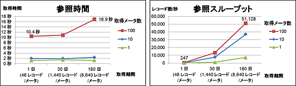 クエリ1では1~100個のメータについて1~180日の時系列データを取得しました。最初にクエリ1をシングルスレッドで発行して測定を行いました。取得メータ数と取得期間を変動させたときのクエリの参照時間と参照スループットを図8に示します。
