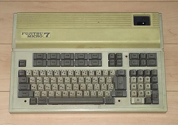 キーボードは本体と組であった。モニターが付いていないノートPCのような本体にキーボードが内蔵された製品(図11)と、セパレート型と呼ばれる現代のPCのように本体とキーボードが別でケーブルで接続する製品があった。PS/2やUSBなどの標準規格はまだなく、セパレート型のキーボード(図12)でも本体は同一メーカーの特定の製品専用であった。そもそも端子の形状からして異なるため、別メーカーのパソコンに接続することは物理的にできなかった。日本語を入力することも想定されておらず、変換キーなどはなくスペースキーは横に長く、またファンクションキーも大きく5つ並んでいる機種(図13)が多かった。起動直後のデフォルト動作として、[F4](ファンクションキーの4番、右から2番目)キーがLISTコマンドと言ってBASIC言語インタープリタに現在読み込まれているプログラムの内容表示、[F5](ファンクションキー5番、一番右)キーがRUNコマンドと言ってプログラムの実行、などと定義されていた。