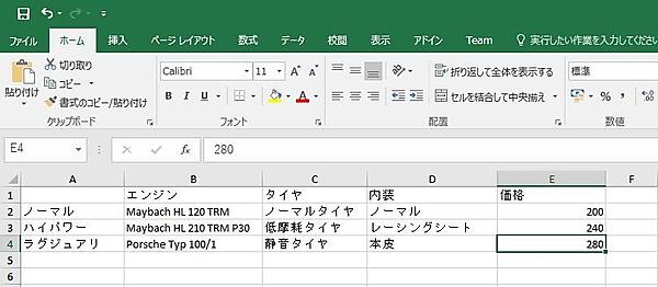 構造体はデータをどのような形で読み込むのか定義するのに使います。今回は「エンジン」「タイヤ」「内層」「価格」のデータを読み込むので、それに適した形の構造体を定義しましょう。