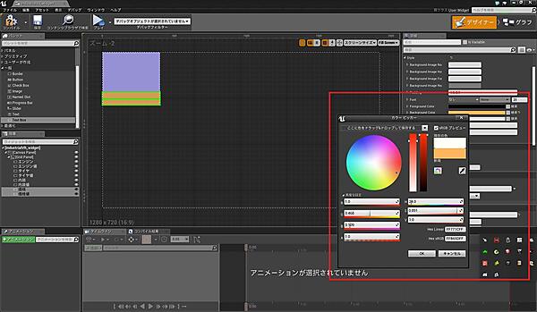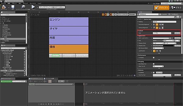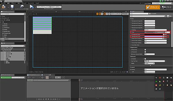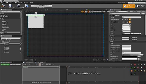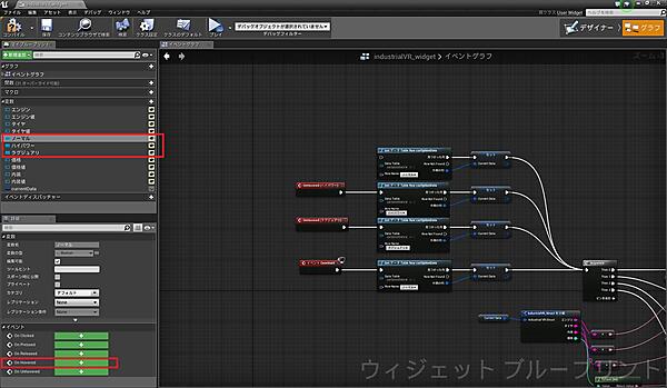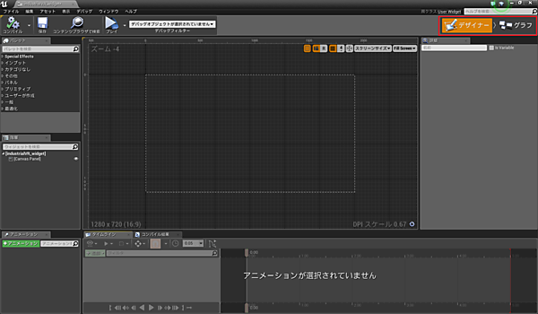 「industrialVR_widget」を開くと、図6のような画面が表示されると思います。ウィジェットブループリントはUI用のブループリントで、「デザイナー」モードでUIのレイアウトを作り、「グラフ」モードでUIの処理を設定します。