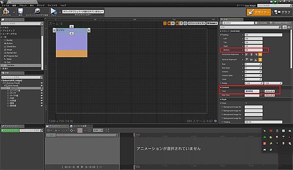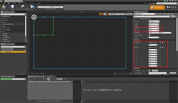 それではまず、「デザイナー」モードでUIのレイアウトを作ってみましょう。パレットのパネル以下にある「GridPanel」というUIパーツを「CanvasPanel」以下にドラッグ&ドロップして追加し、詳細を図7の通りに設定してください。