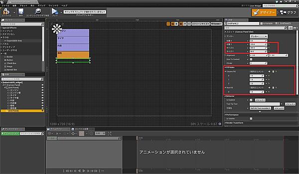 詳細の「Fill Rules」では、列数、行数及びそれぞれの列、行の大きさの比率を設定しています。今回の例では「Column Fill」の項目が1個あり、列は1列、「Row Fill」の項目が8個あるので行は8行、全ての値が1なので、大きさは均等になります。