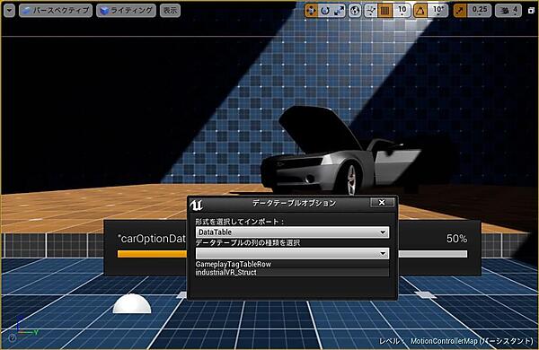 インポート設定ダイアログが表示されるので、「形式」を“DataTable”、「列の種類」を「industrialVR_Struct」にそれぞれ設定して「OK」ボタンをクリックしてください(図20)。CSVファイルがインポートされ、UIフォルダにデータテーブル「carOptionData」が作成されます。
