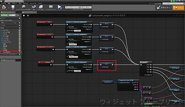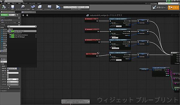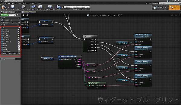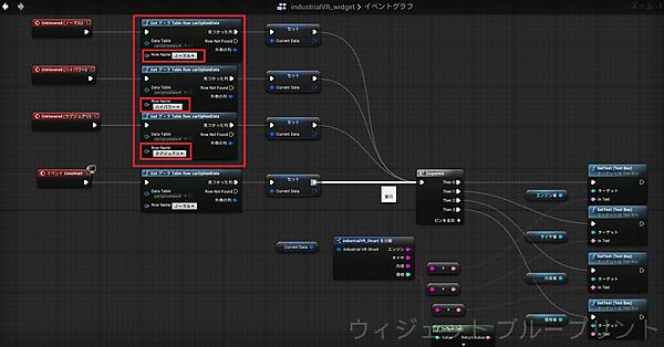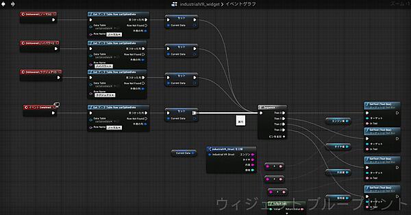 データを表示する際の処理の流れを簡単に説明すると、「Get データ Table Row」ノードでデータを取得して変数に格納し、「industrialVR_shructを分解」ノードでデータを分解、その後各「TextBox」に表示させています。