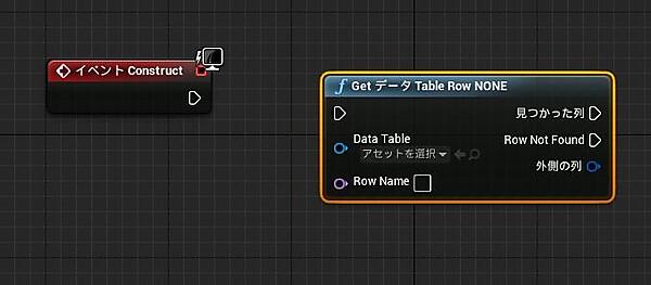 「GetデータTable Row NONE」ノードを配置し、ノード内の設定項目「Data Table」に「carOptionData」「Row Name」に“ノーマル”をそれぞれ設定し、「Construct」イベントの次に配置してください(図24)。「Data Table」に“carOptionData”を設定すると、名前が「GetデータTableRow carOptionData」に変わります。ここで「carOptionData」内の“ノーマル”に対応するデータを取得しています。
