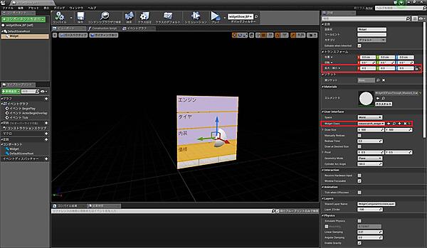 「widgetShow_BP」を開き、「コンポーネントを追加」より「Widget」を選択して、詳細のWidgetClassに「industrialVR_widget」を、詳細の拡大・縮小に「0.3」を設定してください(図29)。