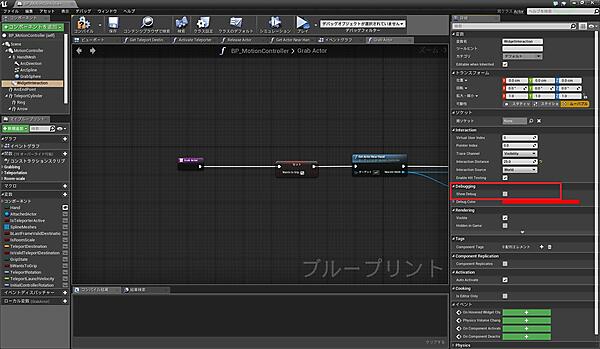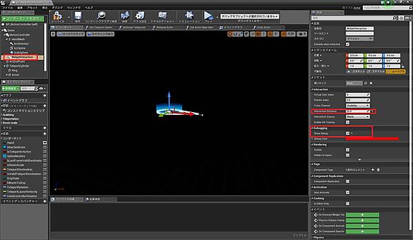 手から出ている赤線はデバッグ用に出しているだけなので、削除しましょう。「BP_Motion_Controller」の「Widgetinteraction」を選択し、「ShowDebug」のチェックを外してください(図38)。