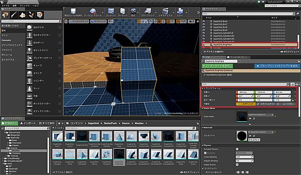 まず、レベルに「SuperGrid_RingPiece」を追加し、図33の通りにトランスフォームを設定します。