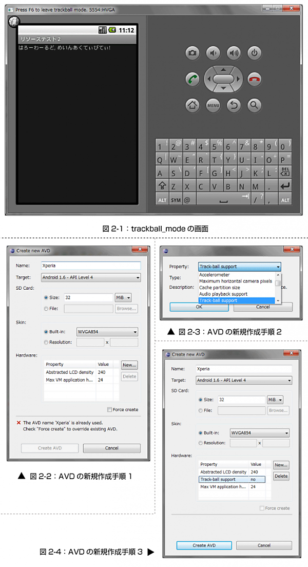 トラックボールが無い端末をエミュレートするには、別途エミュレータのイメージ(AVD)を作成する必要があります。