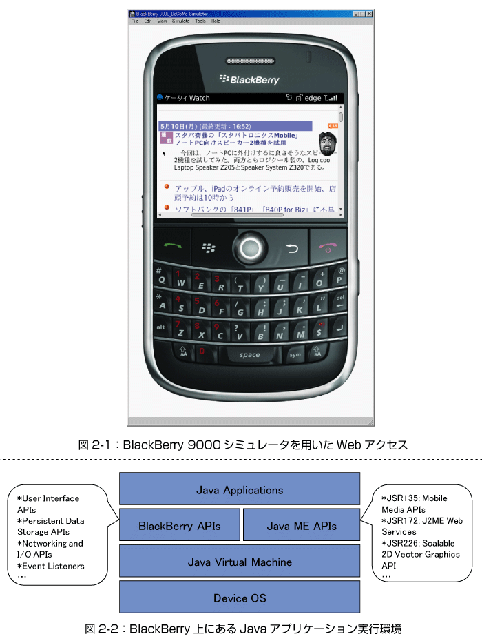 BlackBerryのクライアント開発は、モバイル用のJava規格であるJ2ME(Java 2 Platform, Micro Edition)がベースになります。これに加え、BlackBerryが自前で用意している各種機能のAPI(Application Programming Interface)を公開しているため、これらを組み合わせてコーディングを行います(図2-2)。