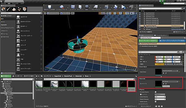 SuperGrid_ConeとSuperGrid_RingFullが配置できたら、Materialsに「M_Tutorial」を設定しましょう(図5)。