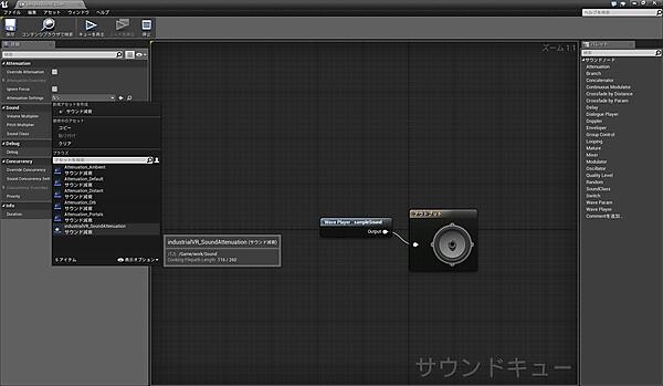 作成したサウンドキューを開き、Attenuation Settingsに「industrialVR_SoundAttenuation」を設定してください(図14)。