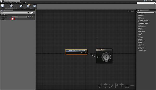 これでサウンド減衰は設定できましたが、このままではサウンドが1回再生された時点で終了してしまいます。「WavePalyer」ノードを選択して、設定項目「looping」をチェックしておきましょう(図15)。