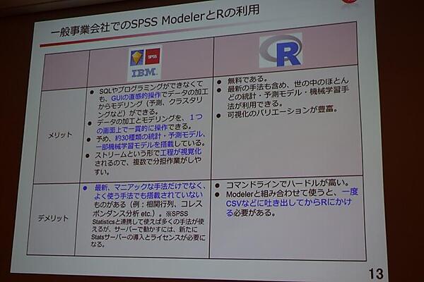 「SPSS modelerは5年前から使っているが便利なツールで、SQLができなくても元データを壊さずに試行錯誤できます。しかし、相関行列やコレスポンダンス分析など基本的な分析ができないのが難点でした。また最新の手法や高度な分析にもチャレンジするようになってきましたが、そのような手法はサポートされておらず、他のツールを使わざるを得ない状況でした」(渋谷氏)とSPSS modelerのメリットとデメリットを指摘した。