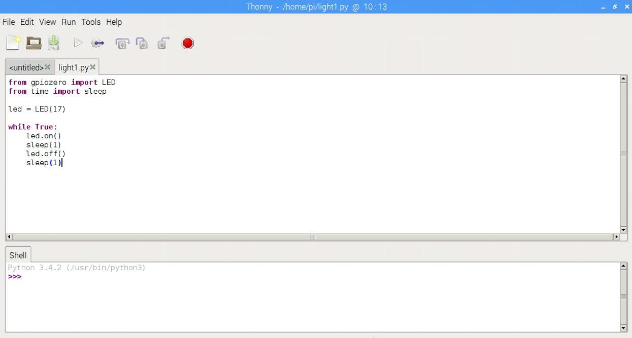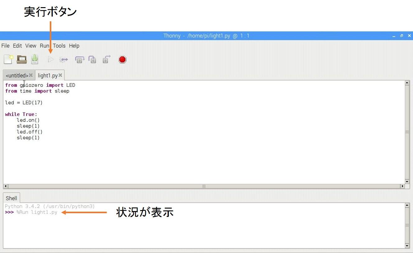 それでは、「Thonny Python IDE」上で恒例のLチカテストを実行してみましょう。「light1.py」というファイルを作成し、以下のプログラムを入力します(第2回でも使用)。