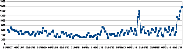 単純に公開された脆弱性情報だけを見ても、昨年末から急激に数が増えています(図1)。