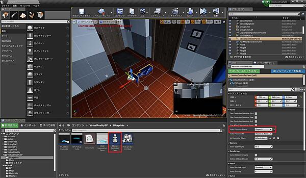 続いて、応接室でもショールームと同じプレイヤーとして「MotionControllerPawn」を使用するため、「Player Start」を削除して「MotionControllerPawn」を配置し、「MotionControllerPawn」の「Auto Possess Player」を「player0」に設定してください(図3)。