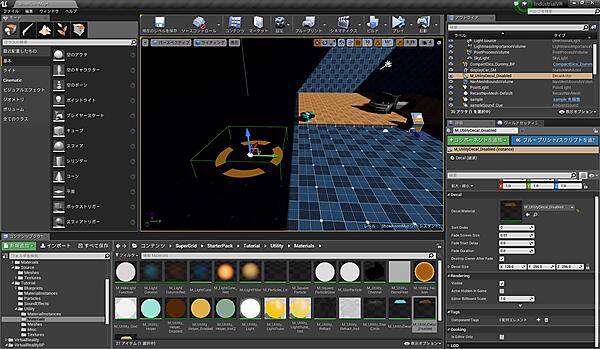 まず、図7を参考にSuperGrid/StarterPack/Tutorial/Utility/Materials以下にある「M_UtilityDecal_Disabled」をレベルへ配置してください。