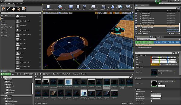 次に、図8を参考にSuperGrid/StarterPack/Source/Meshes以下にある「SuperGrid_CylinderFull」をレベルへ配置します(先に配置したM_UtilityDecal_Disabledの表示に半分かかるような形で配置してください)。