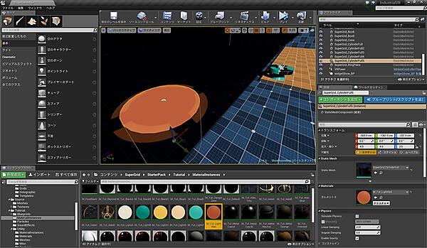 最後に、SuperGrid_CylinderFullのマテリアルをSuperGrid/StarterPack/Tutorial/MaterialInstance以下にある「M_Tut_LightRed」に変更しましょう(図9)。ワープポイントのように見えるものができてきましたね。