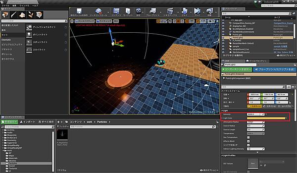 最後に、ワープポイントが発光しているように見せるため、ワープポイントの真上にポイントライトを配置し「Intensity」を「50000」、「Light Color」をオレンジに設定しましょう。