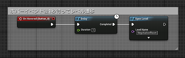 ここからは画面遷移の処理を書いていきます。図18を参考に、openLevel_Widgetのグラフに「購入」ボタンのホバーイベントが走った後、1秒待ってからNegotiationRoomへ画面遷移を行う処理を記述してください。