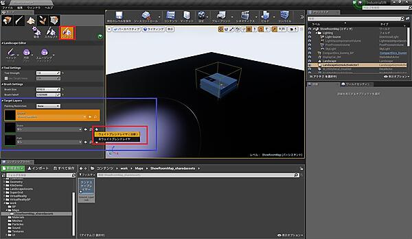 ウェイトブレンドレイヤを追加するとテクスチャのペイントが可能になるので、ランドスケープ上にポインタを持っていき左クリックでペイントしてください。