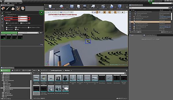 これで地形ができました。次はフォリッジ(草木や岩など地形上に複数配置するオブジェクト)を追加しましょう。フォリッジもテクスチャと同じ要領で、ブラシを使って配置することができます。