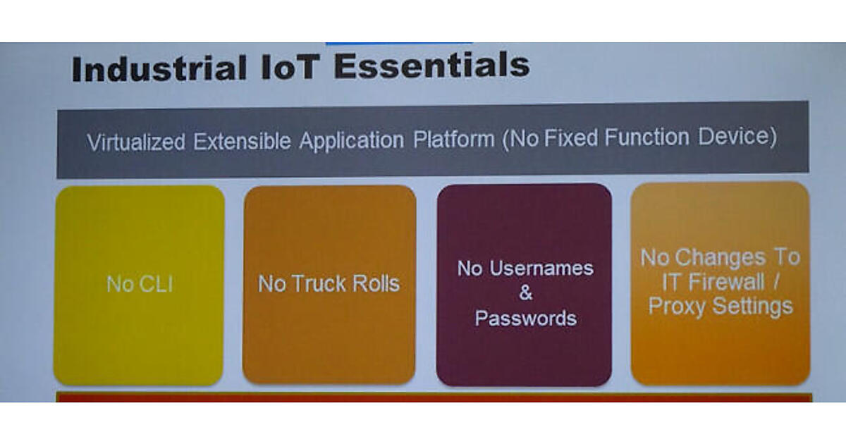 1つ目は、コマンドライン(Command Line Interface、CLI)を使用しないことを表しています、2つ目については、ちょっと説明が必要ですね、機器を設置する際にトラックにエンジニアをたくさん乗せて作業に向かうというのは、その機器の扱いがとても面倒だということを意味しています。我々はそのような機器を使いません。3つ目は簡単に理解できると思いますが、新しいソフトウェアやハードウェアを管理するためにいちいちユーザーネームとパスワードを要求しないということです。そして最後の4つ目は、既存のシステムやネットワークを変更しないことです。以上の4つのNoを実現しているのがIoTiumです。そしてその他に必ず出てくるのがセキュリティです。これはIoTをシステムとして実装する際には必要になるもので、それを後付けではなく最初から組み込んであるというのも特徴ですね。