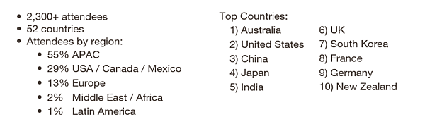 注目の参加人数ですが約2,300名と、前回5月に開かれたボストン(5,000名)の半分以下となりました。グラフにすると以下のようになり、大幅に減ったのがわかります。これだけ減るとさすがにネガティブに思えてしまうのですが、関係者はそれほどショックと感じてはいませんでした。シドニーは北米からもヨーロッパからも遠く、参加者が大きく減ることは想定内だったようです。例えばアメリカ西海岸からシドニーは直行便でも15時間弱かかります。東海岸からだと乗り継ぎが必要となり、丸一日近くかけての移動になります。日本からだと南米に行くのと同じイメージです。そう考えると、これでも集まったほうかなと思えます。