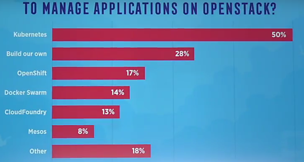 Jonathan Bryceから、OpenStackのこれからの課題は他のOSSやシステムとのインテグレーションだという課題意識が提起されました。ユーザがシステムを構成するためには、OpenStackだけでは足りません。直近のOpenStack User Surveyでは、OpenStack上のアプリケーション管理にKubernetesを使っているとの回答が半数もありました。