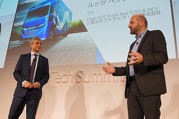 基調講演はまず、同日11月8日に発表となった、三菱ふそうトラック・バス株式会社(MFTBC)のデジタルトランスフェーメーション戦略「Connect X」の支援の話題で始まった。この発表では、Microsoft HoloLensを活用した開発やメンテナンスの変革、Microsoft Azure IoT Hubを活用した運用管理システム「Truckonnect(トラックコネクト)」、社内ヘルプデスクでのAIチャットボット導入が支援内容となっている。
