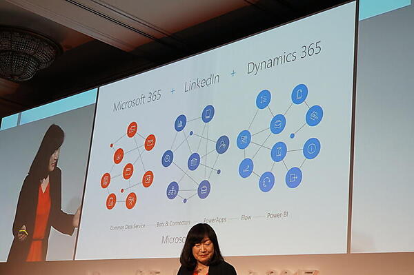 伊藤氏は、Microsoft 365導入による変革について、「資料や作ったものなど、すべてがデジタルアセットとしてアクセス可能になる」という「Microsoft Graph」を取り上げた。Microsoft Graphを有効に使う例が、Microsoftが2016年に買収したLinkedInだ。「社内の連絡先を参照するように、LinkedInの情報を参照できる」と伊藤氏は説明した。それに加えて、データをアクセス可能にすることで、AIと結びついたOffice 365のサーチエンジンが有用なデータをアドバイスしてくれることも伊藤氏は語った。また、「(業務)システムも変わる」としてクラウド型業務システムのDynamics 365を紹介。要件定義を何ヶ月もかけて開発するのではなく、モジュラー化して早く実装するというコンセプトを語り、部門ごとなどに「モダンなアプリケーションをすぐ実装できる」と述べた。