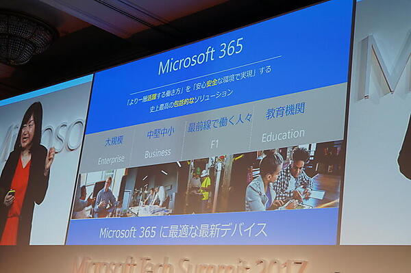 モダンワークプレイスの話の最後として、伊藤氏はMicrosoft 365について「大企業向けだけではない。中堅中小や、現場で働くファーストラインワーカー(F1)、教育機関などにも使って欲しい」と語った。