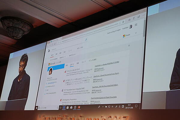 モダンワークプレイスのデモは春日井良隆氏により行なわれた。まず、検索のインテリジェンスの例として、Office 365で「伊藤かつら」さんを検索すると、イターネット上の情報やSharePoint上の文書が検索され、さらにいる場所などもわかる様子が実演された。