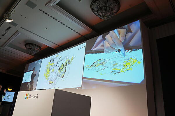 また、チームワークの例として、Surface Hubと、離れたところにいるデザイナーのタブレットとで1つのホワイトボードを共有して共同作業するところも実演した。