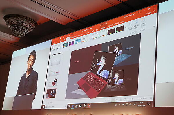 そのほか、PowerPointで、簡単な箇条書きだけ入っているスライドに対してAIがデザインを提案してくれるところや、スライドに3Dのデータを貼って視点を動かして見せるところも実演された。さらに、会場のリアルタイム動画に3Dオブジェクトを重ねる、一種のMR(Mixed Reality)の例も見せ、「最新のWindowsで今日から使える」ことを春日井氏は語った。