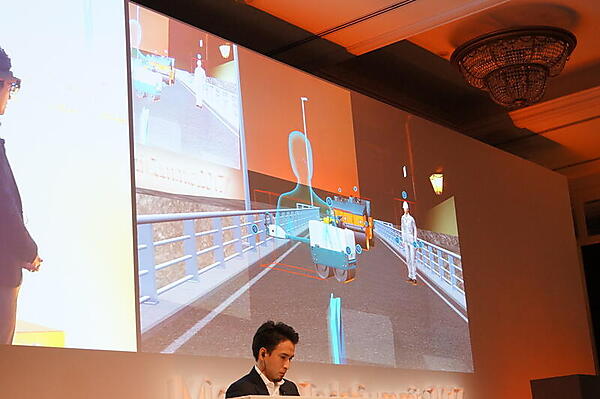 MRのデモとして、小柳建設の「Holostruction」が実演された。「多くの観客のいる場所でデモするのは初」とのことだ。1年半かけて橋を建築するプロジェクトにおいて、3Dで再現された橋の様子が、工程タイムラインのそれぞれの時点にあわせて確認できる。