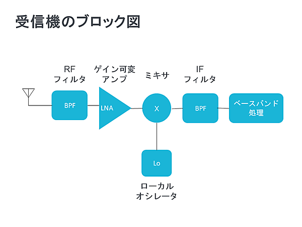 無線通信が有線通信と異なるのは、受信レベルが大きく変動することです。有線通信においては受信レベルが大きく変動することはありませんが、無線通信においては距離の違いによって100倍(20dB)や1,000倍(30dB)レベルが異なることはよくあります。無線通信用のレシーバでは、入力部にあるアンプのゲインで受信感度を調整することによって、入力レベルが大きく変わっても後段に伝える信号レベルを一定の範囲内に抑えます。