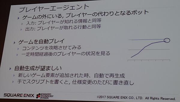 近年は運営型のモバイルゲームが増えており、短期間の開発サイクルでアップデートを繰り返す必要がある。多くのQAテスターが必要になるが、人手で対応するには大変な時間とコストがかかってしまう。そこで、プレイヤーAI(プレイヤーの代わりとなるボット)に自動でプレイさせてコンテンツを攻略させたり、一定時間経過後の状況を観察してQAの効率化を図ったりする。最も重要なのは頻繁な更新に対するアプローチだが、新要素の追加時には自動で再生成できるようになっているそうだ。