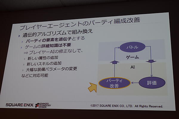 遺伝的アルゴリズムは、良い個体同士の遺伝子を掛け合わせることで次の世代となる新しい個体を生み出す手法だ。この手法で装備の組み合わせを最適化させて成長していく。パーティー編成を遺伝子にしたことで、プレイヤーAIの修正なしで新しい属性やスキルの追加、大幅な装備パラメータの変更に対応できる。ゲームとAI間はAPIを利用しており、指定した設定でバトルを要請し、結果は数値で返ってくる仕組みだ。本来は人間と同じようにプレイさせるのが理想だが、画面の情報を理解するのが困難だという。
