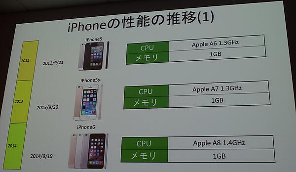 比較対象としてコンシューマゲーム機の性能を振り返ってみると、ハードウェアサイクルが長いという特徴もあり、長期間で段階的にスペックが向上している。一方で、スマートフォン(直近5年のiPhone)の性能は短期間の間に驚異的なスピードで進化していることがわかる。最新モデルに至ってはコンシューマゲーム機に追いつかんばかりの処理能力を誇る。