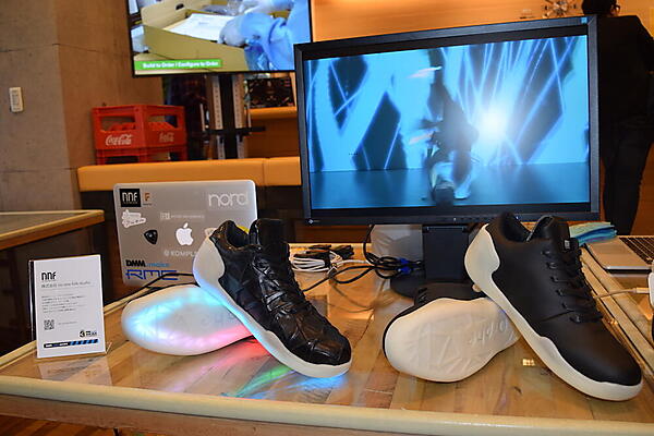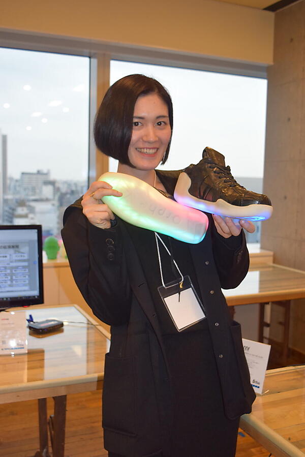 「日常を表現する」というミッションのもと、現代人が忘れがちな「歩く」という行為に着目して生まれたのがスマートフットウェア「Orphe」です。両足に100個以上の個別制御LEDと、リアルタイムで足の動きをセンシングする9軸モーションセンサー、Bluetooth通信機能を内蔵しています。